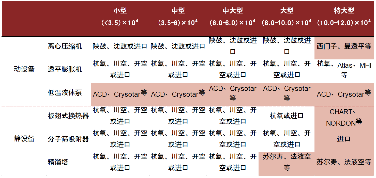 圖表9:國內空分裝置動靜(jìng)設備常(cháng)見選用概(gài)況