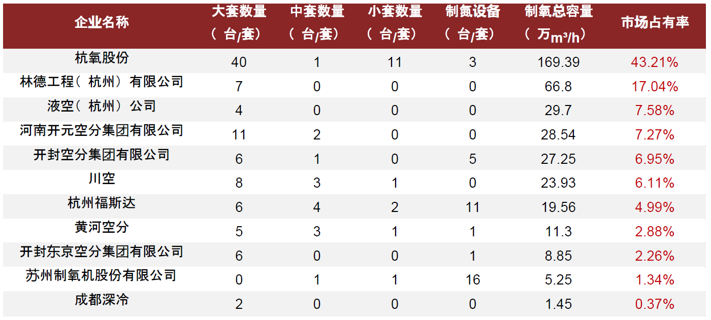 注:上表市場占有率的計算中氮氣容量按0.5係數折算為氧容量。大型空分指6000Nm3/h及以上,中型空分為1000-6000Nm3/h之間,小型空(kōng)分為1000Nm3/h以下。