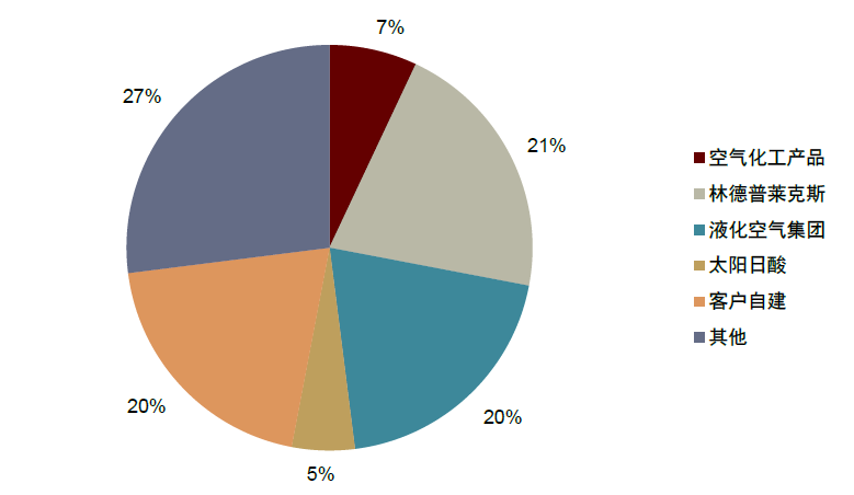競爭格局:空分設備國內市場(chǎng)集中度較高。目前具備大型空氣分離設備(bèi)生產能力的企業數量較少,市場集中度相對(duì)較高。國內從事大(dà)型空氣分離設備製造的企業主要有中外合資企業和非合資企業,中外合資主要有(yǒu)林德公司和液空公司,非合資主(zhǔ)要有杭氧股份、四川空分、開封空氣集團等。根據杭氧股份可轉(zhuǎn)債募集說明書,按製氧(yǎng)總容量為統計口徑,2020年國內市占率前三為杭氧股份、林德公司和液空(kōng)公司,市占率分別為43.21%、17.04%和7.58%。