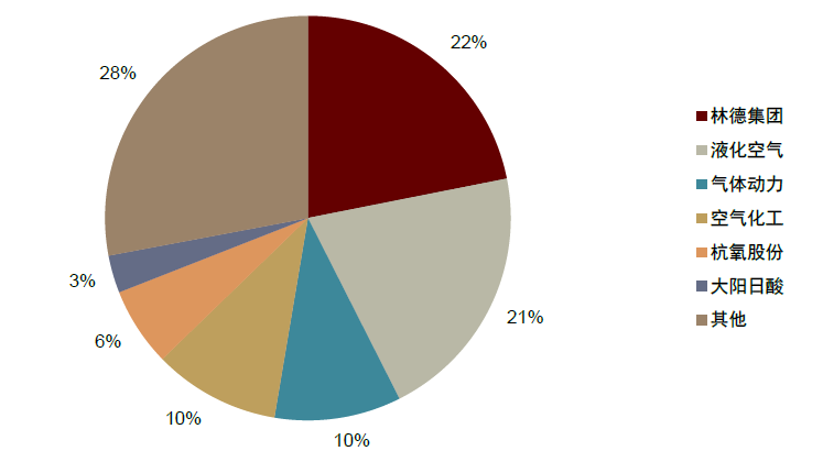 ► 全球工業(yè)氣體競爭格局:根據SAI數據,2013年(nián)全球四大生產商法國液化空氣集團(AL)、德國林德集(jí)團(Linde)、美國普萊克斯(sī)集團(PRAXAIR)和美(měi)國空氣化工產品集團(AirProducts)合計全球市占率達到75%。2018年(nián),林德集團與普萊克斯最終合並,與法(fǎ)液(yè)空、空氣化工(gōng)及太陽日酸一起形成了當前的新四巨頭格局。根據華經產業研(yán)究院數據,2021年,全(quán)球工業氣體市(shì)場CR4為53%。