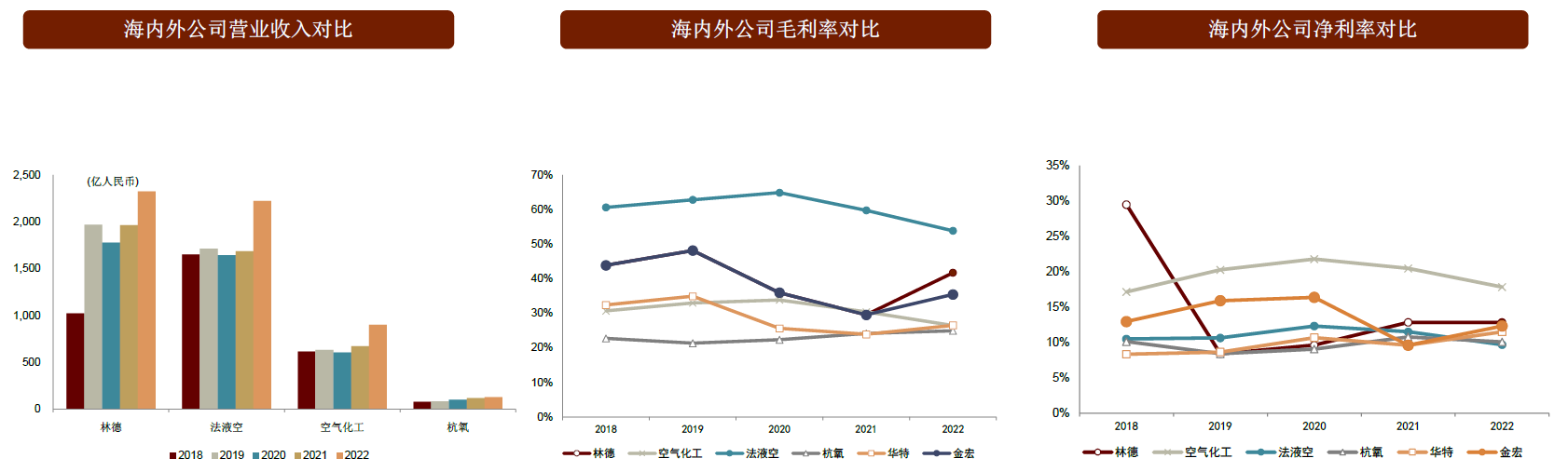 盈利(lì)水平:收入方麵,國內公司收入體量較海外巨頭仍存在較大差距但營收增速較高;利潤率方麵,國內(nèi)公(gōng)司仍(réng)弱於海外巨頭(tóu)。2022年營收規模方麵杭(háng)氧股(gǔ)份等國內廠商和國外龍頭仍然存在較大差距,林德、法液空、空氣化工三大巨頭營業收入(rù)均超過500億元,而(ér)國內(nèi)龍頭杭氧股份僅為128億元,差距明顯;2018-2022年收入端(duān)國外企(qǐ)業林(lín)德、法液空、空氣動力CAGR分別為22.78%、7.74%、10.07%、國內企業杭氧股份、華特氣體、金宏氣體分別(bié)為12.83%、21.66%、16.46%,除去2018年因為兼並(bìng)收購體量增長的林德,增速領(lǐng)先海外企業,這主(zhǔ)要得益於國內工業氣體行業的發展和國產(chǎn)替代的進程。利潤率方麵,2022年林德、空氣化工、法液(yè)空、杭氧股(gǔ)份、華特氣體、金(jīn)宏氣體毛利率為41.70%、26.46%、53.86%、24.95%、26.51%、35.45%,國產廠商(shāng)利潤率(lǜ)相對(duì)較低,同海外公司差距較大,主要是因為(wéi)國內企業起步較晚,前期資本性開支(zhī)較大,且下遊布(bù)局新興領域相較國外龍(lóng)頭仍然較少。