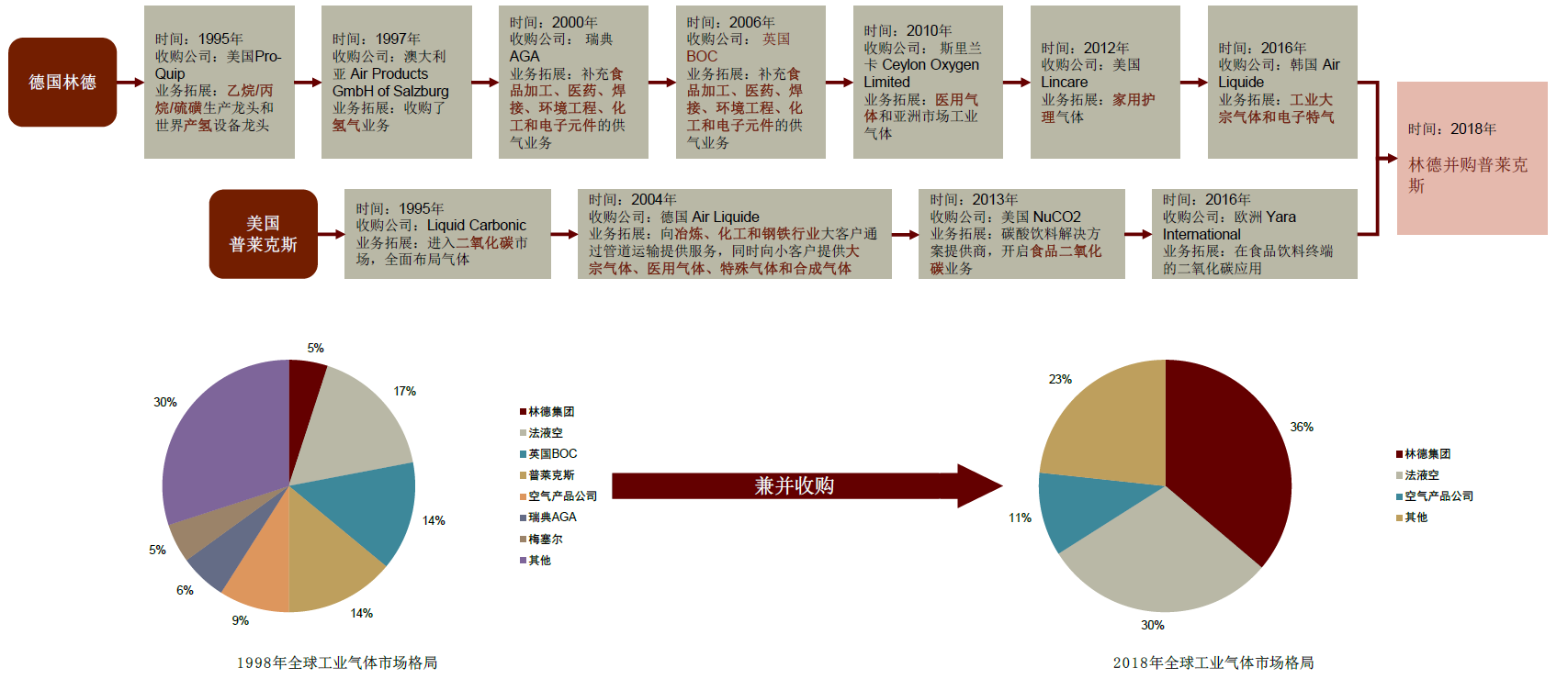 ► 1995年至今:全球技術高速進步,對新(xīn)氣體業務布局主要由收購拓展。2000年,林德與瑞典AGA合(hé)並(bìng),成為全球第(dì)四大、歐洲第二大氣體供應商。2010年林德收購斯裏蘭卡(kǎ)醫用氣體和工業氣體市場的(de)領導(dǎo)者Ceylon Oxygen Limited95%的股份(fèn),這一收購幫(bāng)助集團進入亞洲市場。2012年林德於4月收購了空氣(qì)化工(gōng)在比利時、法(fǎ)國、葡萄牙、西班牙的(de)部分業務、8月(yuè)收購美國公司Lincare,成(chéng)為北美(měi)最大的家庭護理氣體供(gòng)應商。2018年,林德(dé)集團完成對普萊克斯的並購,再次完善工業氣體業務布局,超越所有競爭對手成為全球工業氣體龍頭。