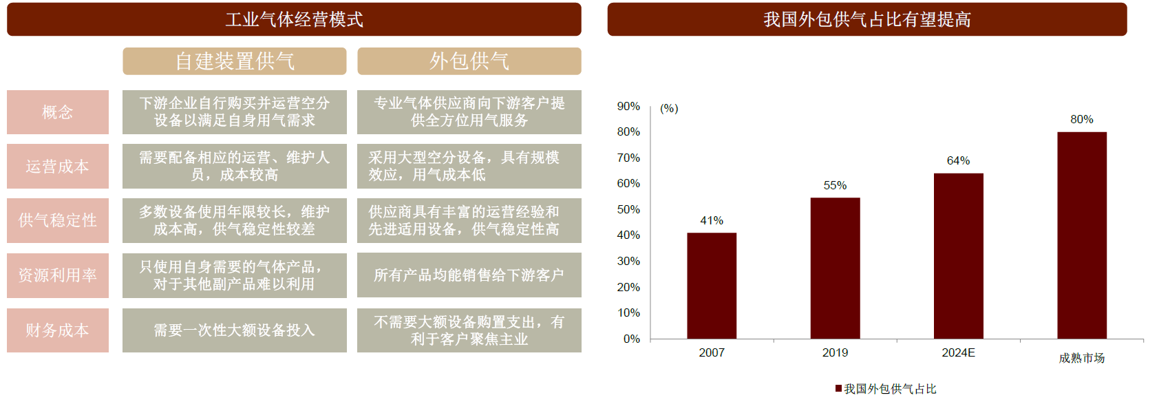 工業氣體的供應模式可以分為自建裝置供氣和外包供氣兩種,外包供氣運(yùn)營成本低、供氣穩定性高、資源利用效率高(gāo),我們認為未來外包供氣的占(zhàn)比有望提高。根據僑源氣體招股書,我國外包供氣比例從2007年的41%提高至2019年的54.6%,杭氧股份可轉(zhuǎn)債說明書中預計到2024年外包占比將逐步提高到64%,但較(jiào)其預計的(de)發達國家成熟市場80%的外包比例仍有較大提升空間。