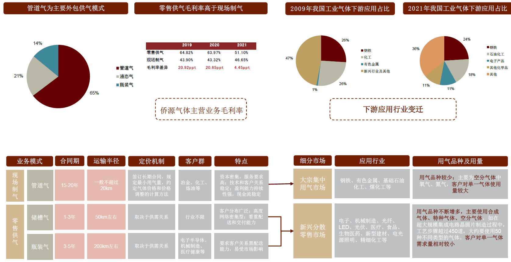 按供氣方式的不同,外包供氣可以分為現場製氣和零售供氣兩種模式(shì),分別對應下遊大宗供氣市場和新興零售市場兩大細分市(shì)場,零(líng)售供氣隨新興零售市場的快速崛起而不斷壯大。新興零售市場符合產業結(jié)構變化趨勢,根據中國產業網數據,占比從2009年的48%升至2021年的58%。現(xiàn)階段雖然(rán)傳統大宗用氣市(shì)場仍占據較大份額,但其市場規模較為穩定(dìng),用氣品類也較為單一。受益於我國新興行業的快速發展,新興零售用氣市場不斷壯(zhuàng)大,用氣數量和用氣種類(lèi)也不斷提高。