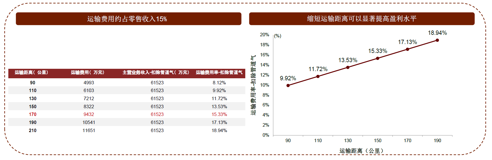 ► 核心假設:1)根據僑源氣體招股書,2021年公司(sī)平均運輸距離為160-180公裏,我們假設為170公裏;2)根據僑源氣體招股書,2021年其運輸費用(yòng)為9432萬(wàn)元,約占其零售供氣收入的15.33%;3)我們假設運輸費用與運輸距離為線性關係。