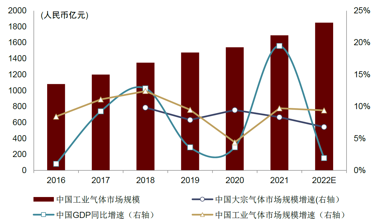大宗氣體(tǐ)市場規模隨GDP增長持續擴容:根據億渡數據,大宗氣體作為工業氣體的主(zhǔ)體,占工業氣體體量的80%,由於大宗氣體的數據相對匱乏,我們將中國工業氣體及大宗氣(qì)體市場規模增速和中國GDP增速作比較(jiào),可以得到工(gōng)業(yè)氣(qì)體增速與GDP增(zēng)速基本在同一增長區間,工業氣體(tǐ)市(shì)場規模增速相對(duì)穩定,我們預(yù)計(jì)大宗氣體將會繼續穩定發(fā)展(zhǎn)。