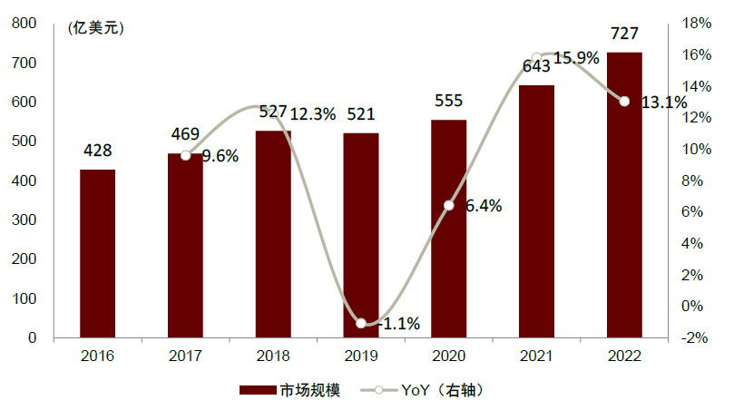 根據億渡數(shù)據資料,特種氣體種類眾多,其中電子特氣(qì)占比高達60%,新興行業(yè)發展帶動特氣持續增長。半導體為電子(zǐ)氣體的(de)主要應用領域,根據國際半導體產業協會(SEMI)數(shù)據(jù),2016-2018年全球半導體材料市場規模逐年增長,2019年市場規模下降至521.4億美(měi)元(yuán),同比下降(jiàng)1.1%。隨著半導體需求持續增長(zhǎng),2020-2022年全球半導體材(cái)料(liào)市場規(guī)模快速上升,2022年達到727億美元,同比增長8.9%。在半導體生產材料成本結構中,矽片(piàn)材料占比為38%,電子(zǐ)特氣占比為13%,是除矽片材料(liào)以外的第二重要半導體材料。往前看,半導體行業正處於成長期,隨著通信、汽車電子、人(rén)工智能等新興終(zhōng)端市場飛速發(fā)展(zhǎn),半導(dǎo)體行(háng)業的成長或將推動電子氣體需求不斷增長。