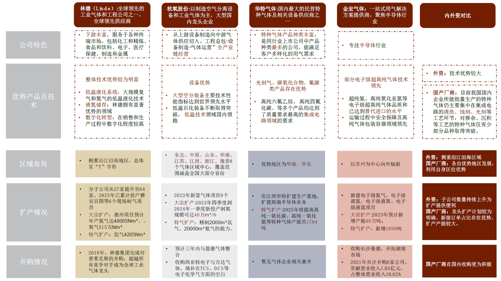 2)我們將國內工業氣體供給側的競爭要素進行拆分,分別為技術、產品布局、區域布局、產能擴張和並購情況等五個競爭要素;我們認為在技術水平、產品布局方麵內資企業和國際巨頭相比(bǐ)仍有一定差距,但(dàn)內資企業在一些特氣品(pǐn)種(zhǒng)方麵已經具備進口替代的能力(lì);內資企(qǐ)業(yè)在需求多樣化背景下,相比國際巨頭在服務響應機製上更靈活,持續(xù)在外資薄弱的環節和地區進行區域布局和並購整(zhěng)合,擴充產品線、順應下遊需求適時擴產,才能有望進一步提升市(shì)占率逐步實現進(jìn)口替代。