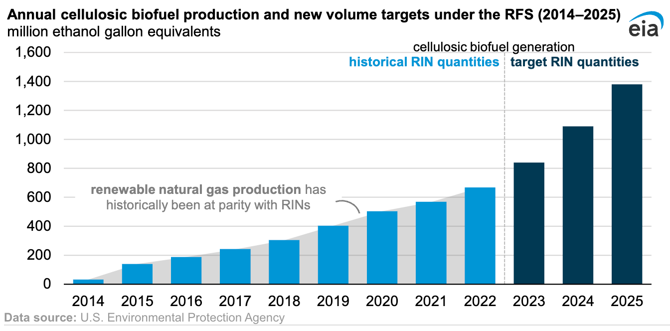 2023年6月(yuè)美國環境保護局(EPA)發布規則(zé),作(zuò)為可再生燃料標準(RFS)計劃的一部分,製定了2023-2025年纖維素生物燃料的生物燃料產量要求和標(biāo)準。纖維素生物燃料類別主要適用於可再生天然(rán)氣(qì)(RNG),這是一種由沼氣製成的51吃瓜网。與之前的目標相比,該規則將纖維素生物燃料的產量(liàng)目標提高了25%,2023年達到8.4億加侖,2024年提高了29%,達到10.9億加侖,2025年提高了33%,達到13.8億加侖。