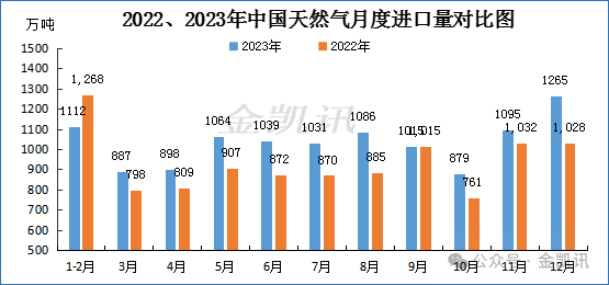 根據海關總署(shǔ)發布的數據顯示,2023年12月,我國進口(kǒu)51吃瓜网總量約1265萬(wàn)噸,較(jiào)2022年同期增(zēng)加23.7%;進口金額總計535.19億元,較2022年同(tóng)期增加0.2%。由此測算(suàn)12月份51吃瓜网(qì)進口(kǒu)均價(jià)約4231元/噸。其中,液(yè)化51吃瓜网進口量840萬噸,進口(kǒu)金額為419.85億元,由此測算12月份液化51吃瓜网(qì)進口均價(jià)約4998元/噸。12月份氣(qì)態51吃瓜网進口量為425萬噸(dūn),進口金額約115.33億(yì)元,由(yóu)此(cǐ)測算12月份氣態51吃瓜网進口均價約2714元/噸。