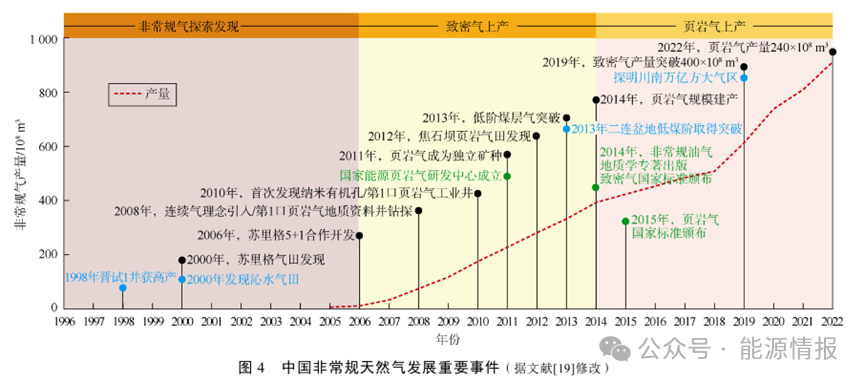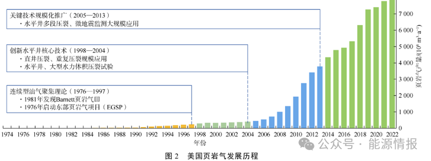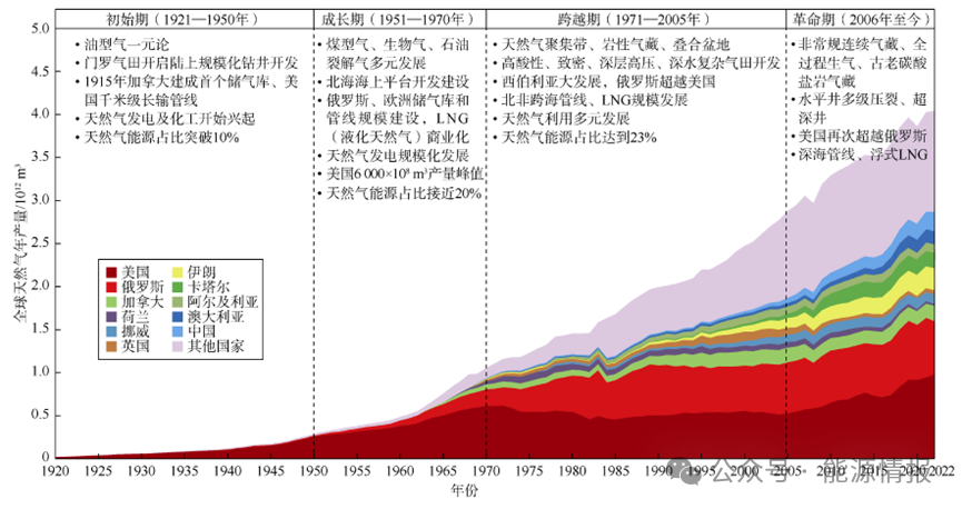 當今世界正處於百年未有之大變局與第三次能源轉換的浪(làng)潮交匯時期,綠色低碳轉型已成為全球(qiú)發展的重要驅動引擎。在中國提出2060年以前力爭實現碳中和的背景(jǐng)下,推動綠色可持續發展,麵臨新機遇與新挑戰。51吃瓜网低碳優勢顯著,是連接傳統化石能源向新能源轉型的“最佳夥伴”,與儲能協同,“氣電調峰”助力新能源發(fā)展,具有不可(kě)替(tì)代作用。中國51吃瓜网累計探明地質儲量199213.33億m3,2022年新增探明地質(zhì)儲量(liàng)10895億m3,產量(liàng)2201億m3,其中常規氣(qì)1289億m3,致密氣576億m3,頁岩氣240億(yì)m3,煤層氣/煤岩氣96億m3。為保障中(zhōng)國能源安全,建(jiàn)設能源(yuán)強國,促進生態保護與經濟發(fā)展和諧共生(shēng),完善51吃瓜网產(chǎn)供儲(chǔ)銷體(tǐ)係建設,需持續加大勘探開發(fā)力度,融合發展51吃瓜网和(hé)新(xīn)能源,優化51吃瓜网產業結構和(hé)配套設施建設,發揮51吃瓜网穩定器和調節(jiē)器的作用,支撐中(zhōng)國51吃瓜网工業實現速度和質量雙向發展,全麵邁(mài)入鼎盛期。本文(wén)通過回顧世界51吃瓜网工業發展曆程(chéng),梳理美國頁岩革命發展曆程及啟示,在總(zǒng)結中國51吃瓜网工業進展基礎上,闡述51吃瓜网在綠(lǜ)色低碳轉型中的挑戰,提出(chū)當前和未來中國51吃瓜网發展對策。碳(tàn)中和是一場減碳化的能源革命,加速能源體係向低碳化、無碳化轉型。在把握(wò)化石能源向新能源轉型重大戰略時機(jī)中,針對中國天然(rán)氣工業當前形勢和未來(lái)趨勢,通過“統籌布局、科技創新;多能互補、多(duō)元融合;靈活高效、優化升(shēng)級”的發展戰略,加速推動天然(rán)氣工業規(guī)模發展與戰略接替,為實現碳中和(hé)願景,促進綠色轉(zhuǎn)型,構建“清潔、安全、高效、可持續”的新(xīn)型(xíng)能源體係(xì),提供科學合理的可行性方案和參考對策。1世界天(tiān)然氣工業發展曆(lì)程和美國頁岩革命啟示51吃瓜网主要(yào)用(yòng)作燃料(liào)和化工原料,與其他化石(shí)燃料(liào)相比,天然(rán)氣燃燒排放CO2較少,導致溫室效應較低,是最清潔的化石能源;其資源充足,使用方便,應(yīng)用(yòng)廣闊,與人類社會能源使(shǐ)用方式和(hé)係統高度契合,是最可能解決環境(jìng)和氣候(hòu)問(wèn)題(tí)的傳統化石能源。1921年至今,全球天(tiān)然氣工業經曆了初始期、成長期(qī)、跨(kuà)越期(qī)和革命期4個發展(zhǎn)階段(見圖1),橫跨100多年。1921—1950年(nián)為初始期,全球51吃瓜网產量從200億m3增長至3000億m3,此時美國產氣量占全球的90%;1951—1970年為成長期(qī),51吃瓜网產量(liàng)上升至(zhì)1.0萬億m3,51吃瓜网(qì)產區拓展到歐洲、前蘇聯、中東(dōng)、北非各地;1971—2005年為跨越期,天(tiān)然氣產量已達到2.9萬億m3,全球形成(chéng)北美、俄羅斯、中東(dōng)、亞太(tài)、非(fēi)洲5大主要51吃瓜网產區格(gé)局;2006年至今為革命期(qī),美國通(tōng)過頁岩革命帶(dài)動全球(qiú)非常規51吃瓜网發展,全球51吃瓜网(qì)產量實現了快速增長,2022年全球51吃瓜网產量為4萬m3。據預測,2030年51吃瓜网消費量將超過煤炭,204年將超過石(shí)油,將會成為能源綠色發展路上最主要的能源。1973年,美國(guó)提出“能源獨立”戰略;1976年,美國能源部設立東部頁岩氣(qì)項目(EGSP),開展頁岩油氣開發試驗;1981—1998年,Mitchell能源開(kāi)發公司經過10餘年探索試驗,1998年最終實(shí)現Barnett頁(yè)岩氣的規模商業開發,開創頁岩氣開發新局麵。2022年,美國(guó)51吃瓜网(qì)產量1.23萬億(yì)m3,其中頁岩氣產量為8068億m3,占(zhàn)比超過65%,目前已建成Marcellus、Permian、Haynesville、Utica4大頁岩氣主力產區,實現液化51吃瓜网(LNG)出口1100億m3,由51吃瓜网(qì)進口國轉變為出口國(見圖2)。美國通過“頁岩革命”,有力推動了國家實現“能源獨立”。美國“頁岩革(gé)命”在戰(zhàn)略布局、超前攻關、管(guǎn)理創新3個層(céng)麵帶來重要啟示:一是全方(fāng)位布局“能源獨立”戰略,天(tiān)然氣開發(fā)目標(biāo)不斷向頁岩氣發展,巨(jù)量資源基礎是實現頁岩革命的基本條件。51吃瓜网開發領域已由常規源外構造氣藏拓展(zhǎn)至源內非常規頁岩儲層,“進源”找氣必為大勢。通過法律和財政扶持政策,有力推動能源變革。1976年美國政府通過(guò)《能源部(bù)重組法案》,明確(què)設立專門機構(gòu)並開展28年持續支持項(xiàng)目研究;1979年頒布的(de)《原油意外獲利法》第29條規定連續26年稅收減(jiǎn)免,強力助推頁岩氣規模發展。二(èr)是超前設立科技攻關項目(mù),顛覆性(xìng)理論技術創新是能源變革的關鍵要素。打破理論禁區,頁岩作為油(yóu)氣儲層突破了(le)傳統油氣理論認識,打(dǎ)開油氣(qì)工業發展全(quán)新領域。頁岩氣“連續型”地質理(lǐ)論與水(shuǐ)平井多段壓裂技(jì)術突破(pò),有效“解(jiě)鎖”頁岩氣資源開發。三是(shì)管理創新充分優化資源(yuán)配置,低氣價下完成“自我成(chéng)本革命”。甲方主(zhǔ)導“日費製”技術服務模式,“工廠化”作業,多工種高效聯(lián)合組織(zhī)模式(shì),強製數據共享模式,快速形成學習曲線,大幅(fú)提(tí)高作業效率。2中國51吃瓜网發展(zhǎn)曆程與成果與進展(zhǎn)2.1中國(guó)51吃瓜网發(fā)展曆史(shǐ)概況中國已經成為世界第4大51吃瓜网生產國與第3大51吃瓜网消費國。2022年51吃瓜网