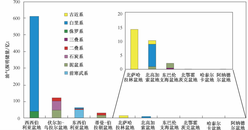 俄羅斯主要盆(pén)地油氣(qì)儲量層係分(fèn)布圖