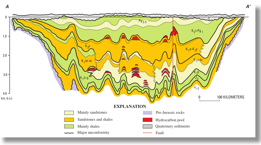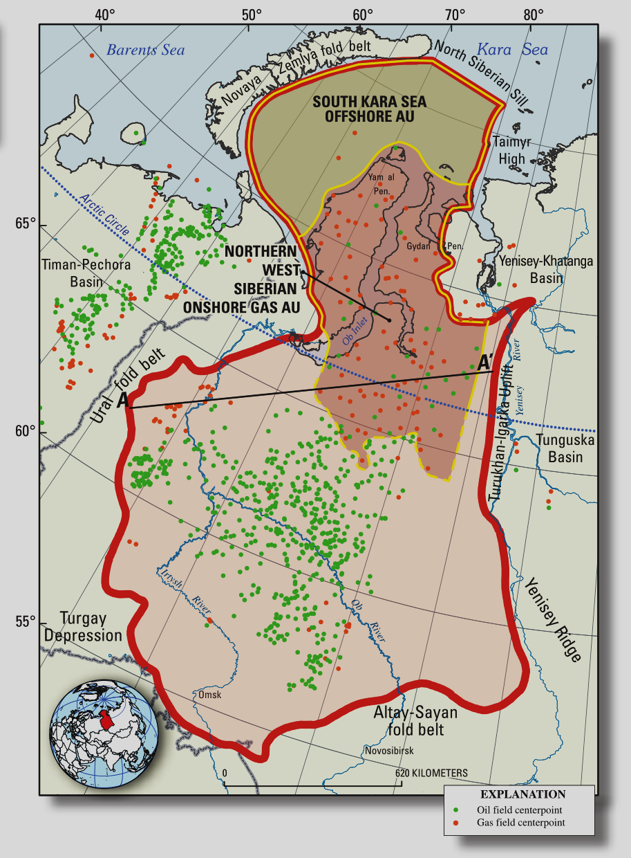 西西伯利亞盆地A-A´剖麵圖,所示部分的(de)位置(zhì)在上圖A-A´(USGS,2008)