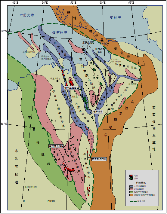 季曼-伯朝拉盆地的主要油氣田分布圖
