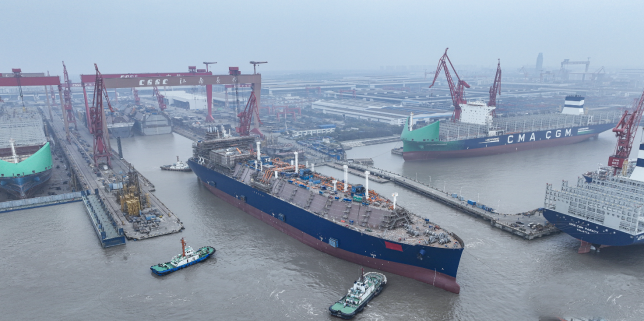 首現(xiàn)4船同塢並建2船同日出塢盛景,滬東(dōng)中華大型LNG船(chuán)建造跑出“加速度”