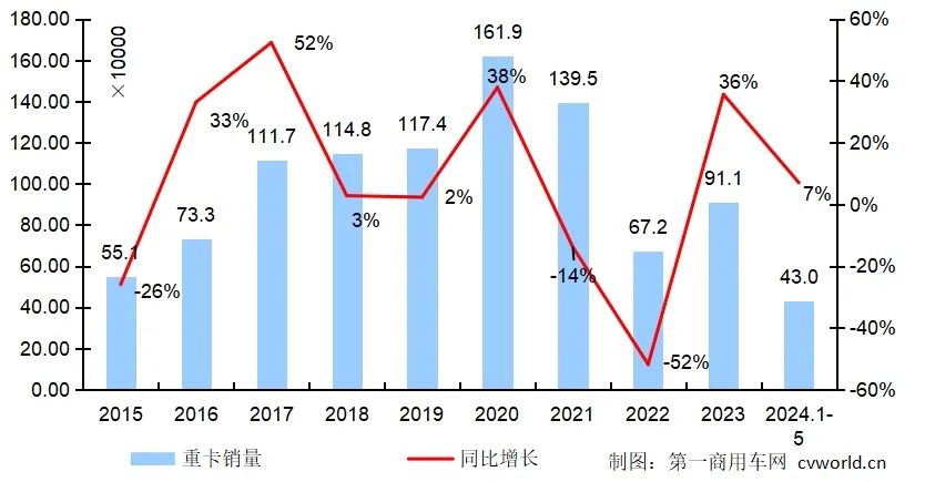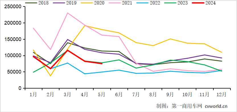 7.5萬輛放在最近八年(nián)來(lái)看,僅(jǐn)高於2022年5月(4.92萬輛),低於其他年份的5月(yuè)份銷量,可見市(shì)場景氣度不高,整體(tǐ)需求明顯進入淡季。累計來看,2024年1-5月,我國重卡市場(chǎng)銷售(shòu)各類車型約43萬輛,比上年同期(qī)上漲7%,淨增加近3萬輛,累計增速較1-4月有所(suǒ)縮窄(zhǎi)。