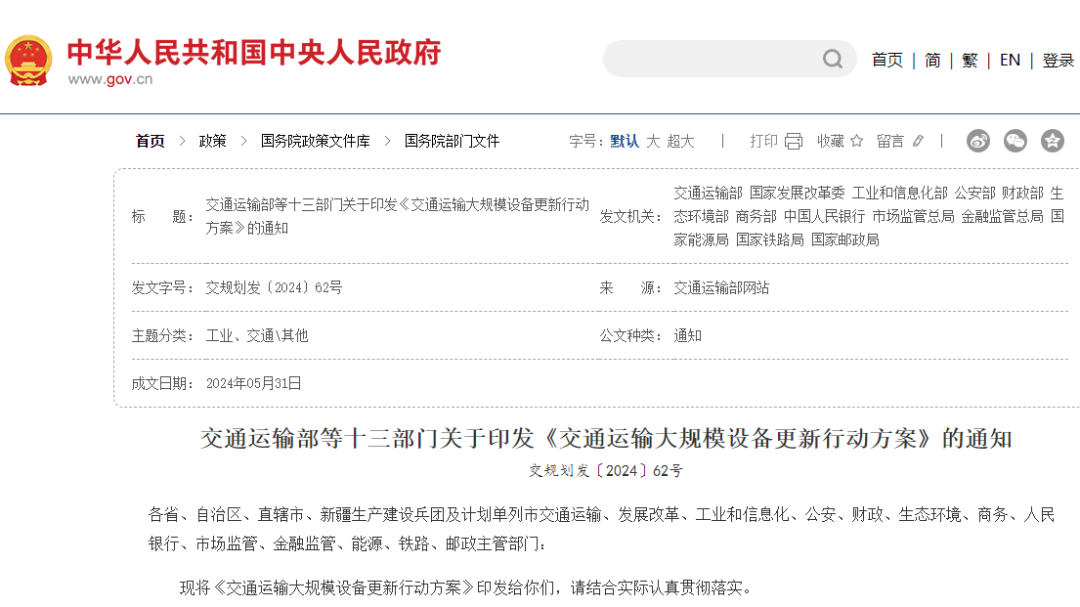 日前,交通運輸部、國家發(fā)展改(gǎi)革委、工(gōng)業和信(xìn)息化部、公安部、財政部、生態環境部 商(shāng)務部、中國人民銀行、市場監管總局 金融監管總局(jú)、國家能源局、國家鐵路局、國家郵政局等十三部門(mén)印發(fā)《交通運輸大規模設(shè)備更新(xīn)行動方案》。