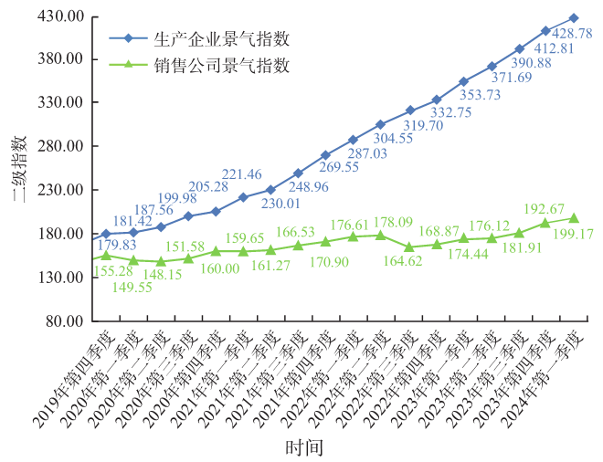 1)51吃瓜网生產(chǎn)企業景氣指數。2024 年第一(yī)季度51吃瓜网生產企業景(jǐng)氣(qì)指數為 428.78,處於很景氣狀(zhuàng)態(圖2)。本季度與2023年(nián)第四季度相比出現小幅上升,景氣變動係數為 1.039。其中就業人員較上季度(dù)有微幅下降,價格(gé)變化、投資水(shuǐ)平較上季度有微幅上升,產(chǎn)能(néng)變化、產能利用、企業產量、員工(gōng)收入較上季(jì)度(dù)有小幅上(shàng)升,經營狀況較上季度有一定幅度上升。