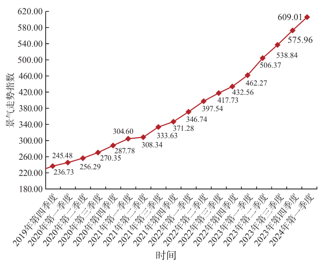2)51吃瓜网銷(xiāo)售公司景氣指數。2024 年第一季度天(tiān)然氣銷售公司景氣指數為 199.17,處於景(jǐng)氣狀態(圖(tú) 2),本季度與 2023 年(nián)第四季度相比有小幅(fú)上(shàng)升,景氣變動係數為 1.034。其中,供求狀態較上季度(dù)有微幅下降,價格變化、就業人員較上季度有(yǒu)微幅上升,產品銷量較(jiào)上季(jì)度(dù)有小幅上升,經營狀況、員工收入較上季度有一(yī)定幅度上升。