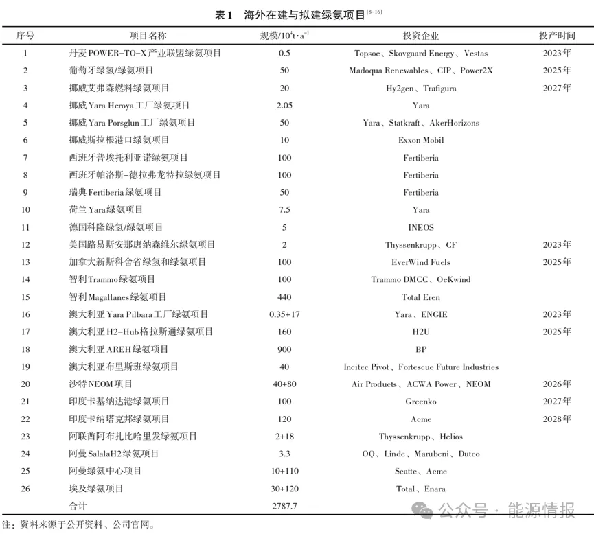 截至2023年9月,全球已布局(jú)超過60個綠氨項目,規劃總產能(néng)超過3500萬噸(dūn)/年。海外綠氨項目主要分布在澳大利亞(yà)、南(nán)美、歐洲和中東,見表1。