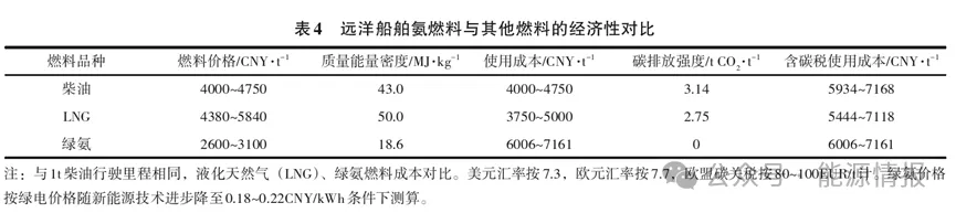 隨(suí)著全球碳(tàn)稅政策(cè)的持續優化與推廣實施,氨燃料發動機實現綠色(sè)安全穩定運行,當綠電價格隨新能源技術(shù)進步降至0.20CNY/kWh左右,車船燃料碳關稅價格超過100EUR/t時,全球綠氨車船燃料將迎來大發展,綠氨作為零碳(tàn)燃料在重型卡車和遠洋船(chuán)舶行業將越來越具有成本競爭力,見表4。