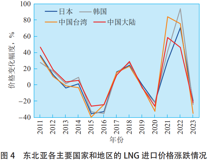二是從2011—2023年價格(gé)漲跌幅度來看,日本、韓國、中國台灣和中國大陸的進口價格走勢基本一致,在價格波動較大的年份表現為同漲同跌,而(ér)在價(jià)格波動較(jiào)小(xiǎo)的年份漲跌情況不一(yī)致(如2013年、2014年和2019年)。中國(guó)大陸近幾年的LNG進口價格波動程度小於東北亞其他進口(kǒu)國(guó)家和地區,可能與中國大陸進口企業根據國際(jì)LNG價格情況積極調整采購策略有關(見圖4)。