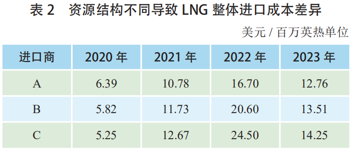 假設(shè)亞太區域不同進口國家(jiā)和地區的3家進口商A、B、C,其LNG長期合同量與現貨資源量的比重分別為9:1、7:3、5:5,3家進口商的長期合(hé)同DES價格均為15%的Brent價格,現貨資源(yuán)DES價格(gé)均為JKM價格,且長期合同、現貨資源均(jun1)為全年均(jun1)勻到貨。經測算,3家(jiā)進口商的整體進口成本(běn)存在較大差異(見表2)。受疫情影響,2020年LNG現(xiàn)貨資源價格低於長期合同價格,現貨在資源結構中占比越高,相(xiàng)應(yīng)進口商的整(zhěng)體進口成本越低;而後伴隨2021年供應形勢緊(jǐn)張及2022年俄烏衝突(tū)的影響,LNG現(xiàn)貨資源價(jià)格遠(yuǎn)高於長期合同價格,現貨在資源結構中占比越高,相(xiàng)應(yīng)進口商的整體進口成本越高(2023年(nián)與此(cǐ)類似(sì))。