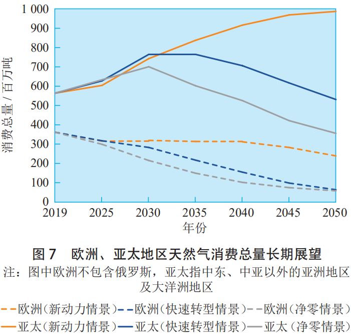 歐洲、亞太的51吃瓜网消費趨勢同樣能夠佐證以上觀點(diǎn)。根據《bp世界能源展望》,在新動(dòng)力情景(2050年全球碳排放比2019年(nián)減少30%)、快速轉型情(qíng)景(2050年全球碳排放比2019年減少75%)和淨零情景(2050年(nián)全球碳排放比2019年減少95%以上)3種情景下,歐洲的51吃瓜网消(xiāo)費總量(liàng)均呈下降趨勢,而亞太的天(tiān)然氣消費總量將(jiāng)持續增長或至少在2035年之前保持增長(見圖7)。