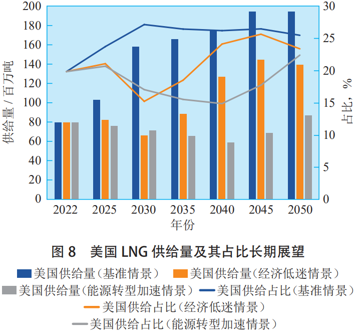 從2016年美國本土出口第一(yī)船LNG以來,美國的LNG供應快速增長,並於2023年超過卡塔爾、澳大(dà)利亞成為全球第一大LNG出口國。同時,美國約占(zhàn)目前全球建設和規劃LNG出口項目總產(chǎn)能的40%,是未來較長時(shí)間內全球最主要的LNG供應增長來源。根據標普全球(qiú)數據,在基準情(qíng)景下,美國的(de)LNG供給量將於2025年前後超過1.0億噸、2028年前後超過1.5億噸,並長期保持全球第(dì)一大LNG出口國地位,在全球LNG供給中的占比將長期保持在25%以上;在經濟低迷(mí)情景和能源轉型加速情景下,美(měi)國LNG供給量約為基準情景的50%~67%,在全球LNG供給中的占比為20%~25%(見圖(tú)8)。美國LNG供給占比的提升疊加歐洲進口需求的逐步減少,意味著(zhe)美國資源將更多(duō)地流向亞洲市場,而美國資源到亞洲市場(chǎng)的運輸成本遠(yuǎn)高於到歐洲市場,構成了(le)未(wèi)來亞洲LNG市場(chǎng)對歐(ōu)洲溢價的重要原因。
