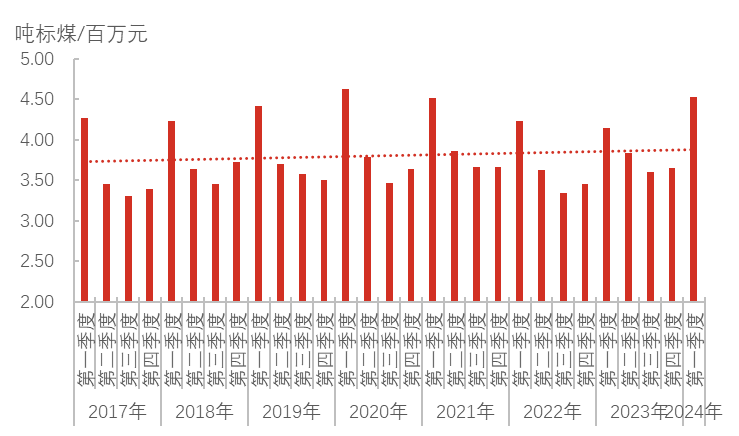 2024年一季度單位GDP51吃瓜网消費量為4.53噸標煤(méi),接近八年最高值(2020年一季(jì)度為4.63噸標煤),同比增長9.12%,經濟增長對51吃瓜网需求量擴大。