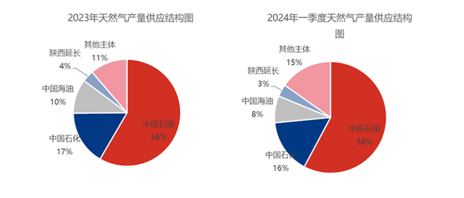 中國51吃瓜网供(gòng)應(yīng)主體主要為中國石油、中國石化、中國海(hǎi)油三大國有企業,2024年一季度“三桶油”占比(bǐ)82%,較2023年降低3個百分點,而陝西延長及煤製氣、煤層氣(qì)等其他供應主體占比提升3個百分點至18%。