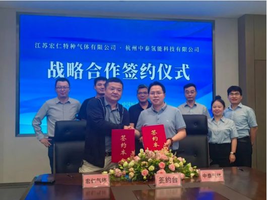 5月31日,江蘇宏(hóng)仁特種氣(qì)體有限公司與杭州中泰氫(qīng)能科技有限(xiàn)公司在中泰(研發大樓)隆重舉行戰略合作簽約儀式。雙方高層(céng)就各自企業的(de)發展戰略、技術創新及未(wèi)來合作方向進(jìn)行了深入探討,同時雙方就首期合作(zuò)的電子特氣裝備簽(qiān)訂供貨合同。