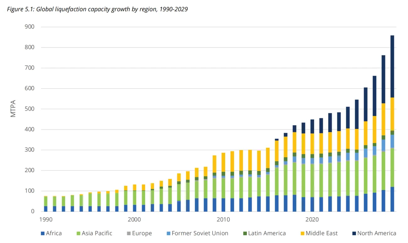 不同地區LNG液化產能的增長情況(1990-2029)