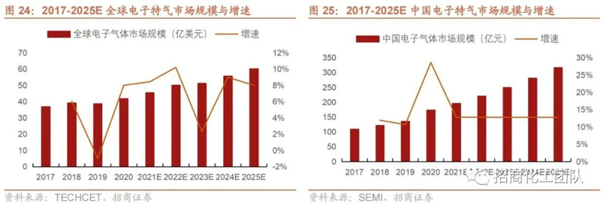 2022年中國電子特氣市(shì)場規模超200億,預計未來仍將保(bǎo)持高速增(zēng)長。近年來全球電子特氣市場規模逐年增長,據TECHCET,預計到2025年全球電子特氣市場規模將達(dá)到60.23億(yì)美元,CAGR為7.3%。我國(guó)正積極承(chéng)接全球第三(sān)次半導體產業轉(zhuǎn)移,下遊市場對電子特種氣體的需求快速提升,據SEMI,2022年中國電子特氣(qì)市(shì)場規模約為220.8億元,同比增長12.77%,未來幾年,由於(yú)先進邏輯(jí)製程及存儲技術(shù)需求增加、顯示市場持續增長、“碳(tàn)中(zhōng)和”及“碳達峰(fēng)”對光(guāng)伏需求的增加,預計電子特氣市場需求將(jiāng)持續保持高速增長(zhǎng)。