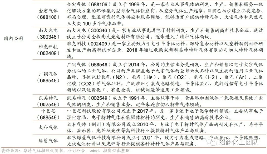 公司是一家專業從事氣體研發、生產、銷售和服務的環保集約型綜合氣體供應商,主營業務(wù)可分為特種氣體、大宗氣體和燃氣三大類,氣體品(pǐn)種約100 多種,公司主(zhǔ)要產品(pǐn)應用於集成電路、液晶麵板、LED、光纖通信、光伏、醫療健康、節能環保(bǎo)、新材料、新能源、高端裝備製造(zào)、食品、冶金(jīn)、化工、機械製造等眾多領域,其中在電子半導體領域,公司已(yǐ)逐步(bù)實現了超純氨、高純(chún)氧化亞氮、電子級正矽酸乙酯、高(gāo)純二氧化碳等(děng)產品(pǐn)的進口替代。公司已成功量產供應中芯國際、聯芯、積塔、SK海力士(shì)、長江存(cún)儲等公司,台(tái)積電(diàn)、長鑫存儲、三星電子等均在產品測試過程中。未來,公司將繼續堅持縱向開發戰略,加大(dà)特氣新品研發投入,加速新品推出,公司規劃六氟丁二烯、一氟甲烷(wán)、八氟環丁烷、二氯二氫(qīng)矽(guī)、六氯乙矽烷、乙矽(guī)烷及三甲基矽胺等產品產業化。