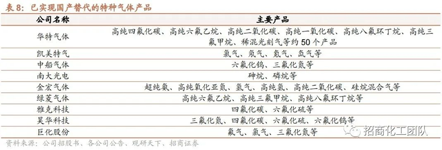 國內企業(yè)快速成長,多種特種氣體已實現(xiàn)國(guó)產替(tì)代,國產化進(jìn)程將加速推進。中國的特種氣體行業經過30年(nián)的發展和沉澱,通過(guò)不斷的經驗(yàn)積累(lèi)和技術進步,業內領先企業已在部分產品上實現突破,達到國際標準,逐步實現進(jìn)口替代,特種氣體國產化具備了客觀條件。