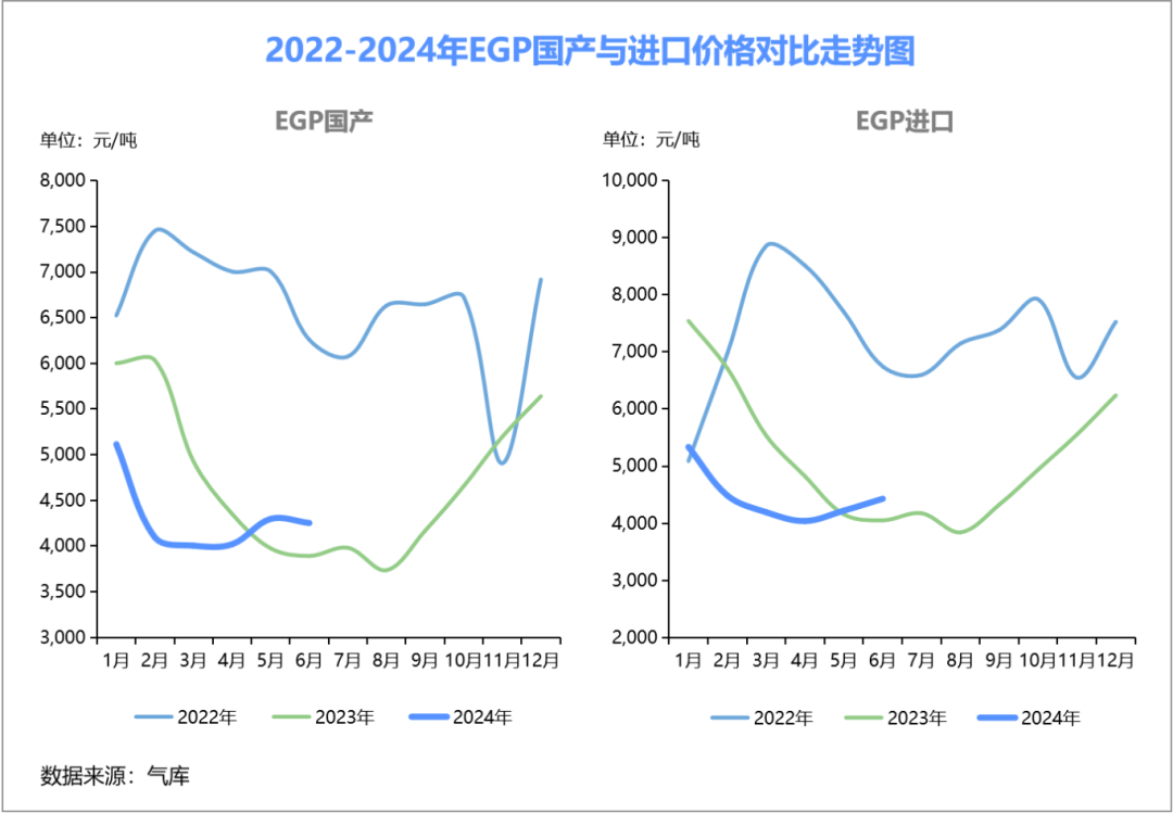 1-6月國產EGP(出廠成交價)均價(jià)為4298元/噸,同比下降11.62%,進口EGP均價為4451元/噸,同比下降18.63%。其(qí)中國產EGP 相較進口EGP波動更為(wéi)頻繁,呈震蕩走跌趨勢,1-2月春節前後,終端需(xū)求低迷液價隨之滑落,3月國內陸續(xù)停止供暖,補庫需求暫停後液價再(zài)次(cì)下調,4-6月進入常規淡季(jì),西北、華北、西南國產液廠進(jìn)行常規檢修,外加原料氣成本(běn)高企,在低庫存高成本支(zhī)撐下液價聯動(dòng)上(shàng)漲。但受製(zhì)於終端接貨能力有(yǒu)限,國產LNG價格後期漲幅放緩。