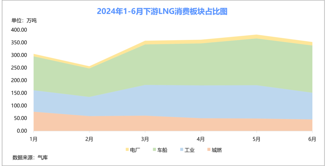 2024年1-6月各板塊消費量合計為2016.95萬噸,同比2023年上半年增加20.86%。其中(zhōng)車船板塊消費量不僅是LNG用量最大的板塊,也是去年同期(qī)增速最快的板塊,同(tóng)比增長率為26.35%。