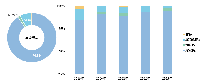 我國加氫站壓力等(děng)級以35兆(zhào)帕為主,占比90.5%,與我國燃料電池(chí)汽車主要為35兆瓦商用車的發展現狀相一致(zhì)。由於70兆帕高壓儲氫罐在同等體積下可以儲存更多氫氣,且能更好的支撐(chēng)乘用(yòng)車等更多元車型示範,2021年以來,我國含(hán)70兆(zhào)帕功能(néng)加氫站推廣占比逐步提升。2023年,我國(guó)含70兆帕功能加氫站占比達5.0%。