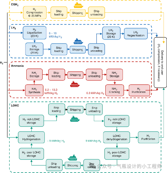 與化石燃料及其衍生物相比,氫氣的一個獨特特性是,它可以通過化學或物(wù)理方式與適當的液(yè)體或固體材(cái)料結合來儲存。盡管(guǎn)技(jì)術準備水平 (TRL) 相對較低,但基於材料的儲氫技術改善了氫作為儲能介質的應用,並提供了第 2.4-2.6 節(jiē)中回顧的運輸氫的替代方式(shì)。本文的特別關注點在於第(dì)2.7節中(zhōng)不同儲(chǔ)氫技術(shù)的比較。因此,不僅(jǐn)要考慮(lǜ)關鍵技術特點,還要考慮實現儲存條件(jiàn)和釋放氫氣的能耗,以及優先應用領域。第 3.5 節比較了與運輸距離相(xiàng)關(guān)的不同氫氣運輸方法,特別是從經濟角度來(lái)看。最後,在第4節中,我們(men)簡要介紹了如何為不同的應用場景選擇合適的氫氣儲存和運輸方式,並在(zài)國(guó)家和區域層麵建立氫基礎設施發展戰略。