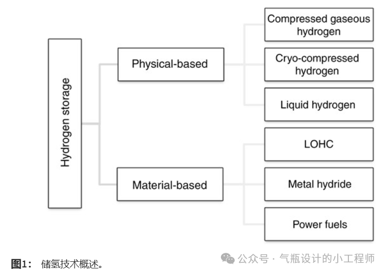 一般來說,儲氫係(xì)統可分為兩類:基於物理的儲氫係統和基於(yú)材料的儲氫係統(見(jiàn)圖1)。在(zài)前一種情況下,氫氣通過改變其(qí)物理狀態來儲存,即增加(jiā)壓力(壓縮氣態儲氫,CGH2)或將溫度降低到其蒸發溫(wēn)度(dù)以下(液態氫儲(chǔ)氫,LH2)或(huò)同時使用兩種方法(低溫壓縮儲氫,CcH2)。在基於材料(liào)的存儲中,應用附加材料作為“載(zǎi)體”。它們可以物理或化(huà)學地與氫分子或原子結(jié)合,因此與基於(yú)物理的存(cún)儲係統相(xiàng)比,它們可(kě)以(yǐ)提高存儲密度和安全性。然而,大多數基於材料的存儲技術仍處於實驗室和示範階段。