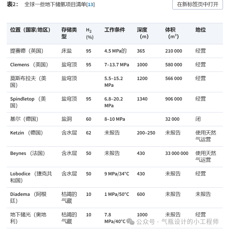 除了壓力容器外,另一種儲存壓縮氣態氫氣的有前(qián)途的方法是使用現有和適(shì)當(dāng)的鹽穴(xué)、含水(shuǐ)層和枯竭的氣(qì)藏。地下(xià)儲氫(UHS)是專門為中長期儲存進口或(huò)季節性(xìng)可再生能源產生的大量剩餘(yú)氫而開發的。顯(xiǎn)然,地質標準是(shì)研究(jiū)人員和工程師在評估潛在(zài)的超高清遺(yí)址時的主(zhǔ)要關注點。鹽穴通常是純氫儲存的最佳(jiā)候選者。這不僅(jǐn)是由於其沉(chén)積物的密封(fēng)性、鹽的良好機(jī)械性能及其對化學反應的抵抗力[11],還因為它的粘彈性蒸發岩對氣體有很好的密封(fēng)作用[12]。此外,鹽水條件抑製(zhì)了儲存氫氣的微生物消耗[12]。不幸的是,鹽穴的體積相對較小(xiǎo),分布不廣。貧(pín)化氣藏體積較大,在勘探和開采(cǎi)過程中地質結構和特(tè)征得(dé)到很好的識別,具有顯著優勢(shì)[11]。然而,殘留(liú)的51吃瓜网會降低儲存氫氣的純度。如果母岩(yán)存在良好的儲集層特性(xìng)和防止儲存氫遷移的不透水層,則體(tǐ)積非常大且易於找到(dào)的(de)含水層將(jiāng)成為儲(chǔ)氫的一種選擇。然而,由於含水(shuǐ)層的多孔性質、生化(huà)反應以及儲層岩石中氫氣與礦(kuàng)物的反(fǎn)應(yīng),其缺點是沿未探測到的斷層可能(néng)泄漏。迄(qì)今(jīn)為止,尚未報道含水層中的純氫儲存。Zivar等[13]總結了全球現有的一(yī)些超高溫高(gāo)溫(wēn)排放係統案例,並(bìng)分別將不(bú)同的氫(qīng)氣應用與合適的超高溫排放係統進行了比較,如表2和表(biǎo)3所示。