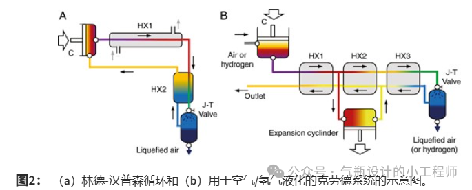 1895年,卡爾·馮·林德(Carl von Linde)和(hé)威廉·漢普森(William Hampson)分(fèn)別發明了一種循環工藝來液化適(shì)合工業用途的空氣。如圖(tú)2a所示,壓縮機(C)首先將空氣從2MPa壓縮到6MPa,然後通過水熱交換器(HX1)輸送壓縮空氣。隨後(hòu),預冷的壓(yā)縮空氣被送入逆流熱交換器 (HX2) 並通過 J-T 閥鬆弛(等焓體積增加)。空氣的一部分由(yóu)此液化,而(ér)另一部(bù)分氣態冷卻的空氣則通過HX2,在那裏冷卻進入的空氣,然(rán)後返回壓縮機。然而,林德-漢普森循環無法液化氫氣,除(chú)非它與液氮預冷係統相結合[15]。