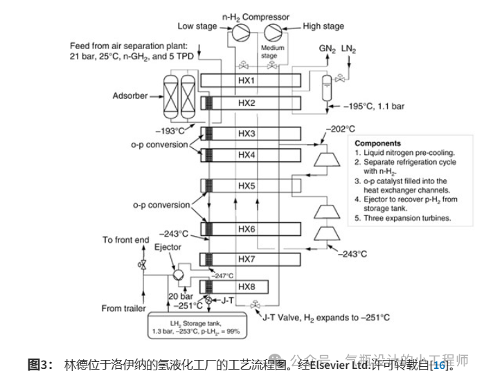 例如,在德國,目前有一家(jiā)位於洛伊納的氫液化廠,其生產能力為每天 5.5 公噸 (mTPD),自(zì) 2007 年以來(lái)一直在運營。洛(luò)伊納的第二座相(xiàng)同(tóng)容量的液化器計劃於 2021 年上線。英戈(gē)爾施塔特的工廠自 1992 年開始運營,現已退役(yì),產能為 4.4 mTPD。所有這些設備都基於帶有液氮預冷的 Claude 係統,並由林德(dé)股份公司提供和運營(yíng)。與原來的克勞(láo)德係統相比,現代氫(qīng)液(yè)化裝置(如圖(tú)3所示)展示了更(gèng)多的(de)低溫膨脹渦輪機和更多的熱交換器,並(bìng)集成了催(cuī)化鄰位(wèi)對氫(qīng)轉換器(qì)。此外,克勞德循環與冷卻路徑分離以液(yè)化氫氣。根據Cardella等[17]的計算,一個容量為5 mTPD的傳統現代工廠消耗10 kWh的電力來液化1公斤氫氣。如果(guǒ)未來通過應用混合製冷劑預(yù)冷,將產能提高到100 mTPD,他們預計將減少40%的能耗。