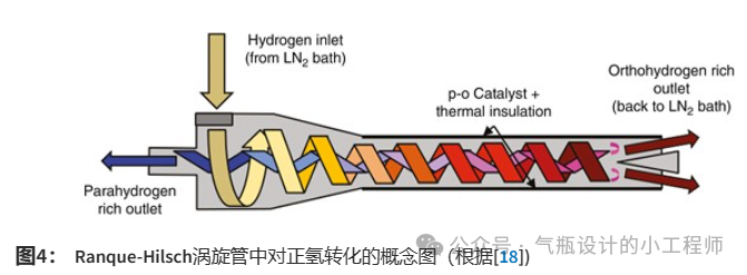 作為廣泛使用的基於克勞德循環的製冷係統的潛在替代方案,華盛頓大學的Jacob Leachman博士和他(tā)的團隊發(fā)明了一種有趣的冷卻係統,將Ranque-Hilsch渦旋管與對(duì)位氫轉化的吸(xī)熱轉換相(xiàng)結合[18,19]。 如圖(tú) 4 所示,首先在 77 K 的液氮 (LN2) 浴(yù)中以 ~50% 的平衡對位成分預冷加壓氫流 (~3.5 bar),然後注入渦旋管中。在渦流室中,氫流被加速到高轉速,並逐漸分離成兩種(zhǒng)不同溫度的流體。旋轉流外殼中(zhōng)的氫(qīng)分子越(yuè)來越熱,旋(xuán)轉速度越來越快,而內部的分子越來越冷(lěng),旋轉速度越來越慢。管內壁上的對位-鄰位(wèi)催化劑塗層進(jìn)一步將(jiāng)較熱的對位氫(qīng)轉化(huà)為正氫。由於管壁上的絕緣材料可防止來自環境的熱傳導,因此轉換所需的熱能是從內部較冷的氫流體中提取的,從而增強了整體(tǐ)冷卻。通過錐形噴(pēn)嘴,溫暖的富(fù)氫外流(~120 K,75% 正氫,1 bar)被允許從管(guǎn)中逸出並被回收,而冷的富氫內(nèi)流(~30 K,25% 正氫,1 bar)被迫返回並通過另一個出口離開管子,在那裏它可以(yǐ)被引導到二次渦(wō)流管中(zhōng)進行進一步冷卻,或者被引(yǐn)導(dǎo)到傳統的 J-T 閥或閃蒸分離器中,用於液化。