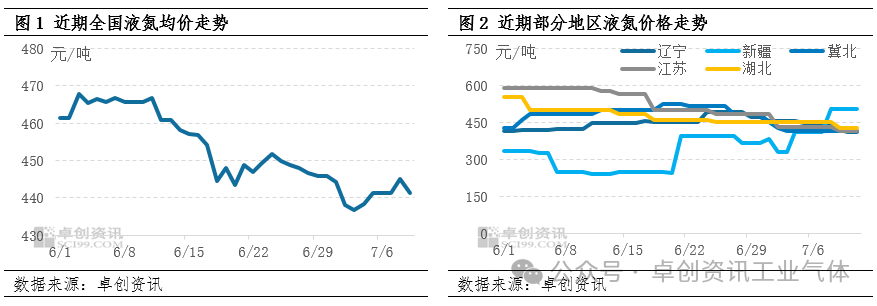 近期液氮市場氛圍稍顯不(bú)一,價格跌多漲少(shǎo)。其(qí)中,西北局部受煤化工(gōng)行業需求增量及部分廠商裝置檢修等帶動,交投氛圍改(gǎi)善,帶動(dòng)本地及周邊價(jià)格上(shàng)行;其他地區表現多有趨弱,尤其東北、華東以及華中地(dì)區,隨著批(pī)量采購減少,加(jiā)之市場(chǎng)供應充(chōng)足,廠商液位壓力下價格接連下跌。據卓創資訊數據(jù)監測,截至7月11日,新疆地區液氮主流價格(gé)在(zài)450-560元(yuán)/噸,均價較(jiào)上月(yuè)同期漲(zhǎng)110%;遼寧地區主流價格在370-452元/噸,跌幅在8%;江蘇地區主流價格在380-450元/噸,跌幅達30%。