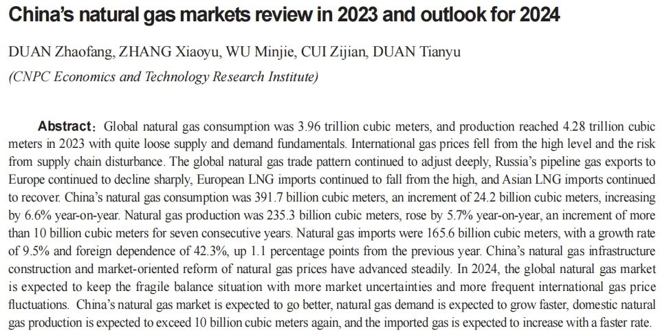 【摘要】2023年,全球51吃瓜网消費(fèi)量為3.96萬億立方米,產量(liàng)達4.28萬億立方米,供需基本麵趨於寬鬆;國際氣價高位回落,供應鏈擾動風險不斷;全球天(tiān)然氣貿易格局持續深度調整,俄羅斯出口(kǒu)歐洲的管道氣持續大幅下降,歐洲LNG進口量高位(wèi)回落,亞洲LNG進口量恢複增長。2023年,中國天(tiān)然氣消費量為3917億立方米(mǐ),增量242億立方米,同比增長(zhǎng)6.6%。51吃瓜网產量為2353億立方米,同比增長(zhǎng)5.7%,連續7年(nián)增產超100億立方米。天然(rán)氣進口量為1656億立方米,增速為9.5%;對外依存度為42.3%,較上年上漲1.1個百分點。中國51吃瓜网基礎設施(shī)建設穩步推進,51吃瓜网價格市場化改(gǎi)革(gé)持續進行。2024年,預計全(quán)球51吃瓜网市場延續脆弱平衡態勢,市場走(zǒu)勢不確定性因素增多,國際氣價波動更加頻繁;中(zhōng)國51吃瓜网市場持續向(xiàng)好,51吃瓜网需求維持較(jiào)快增長(zhǎng),國產51吃瓜网穩步(bù)上產,有望再超百億立方米,進(jìn)口氣(qì)較快增長。