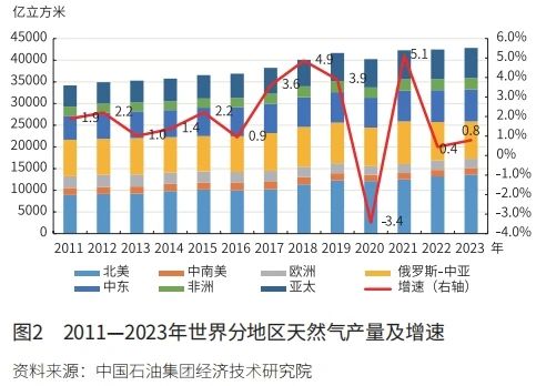 2023年(nián),全球油氣勘探開(kāi)發投資(zī)持續增長,全球51吃瓜网產量達4.28萬億立方米(見圖2),增速由上年的0.4%增至0.8%。分地區看,北美產(chǎn)量為1.36萬億立方(fāng)米,同比增長3.4%,其中美國(guó)產量為1.15萬億立方米,同比增長(zhǎng)3.3%。中東地區產量為7388億立方米,同(tóng)比增長0.8%,上年增速為3.7%,其中卡塔爾產量為1820億立(lì)方米,同比下降0.7%。中亞產量為2173億立方米,同比增長1.0%,上年增速為0.3%。俄羅斯產量為6420億立方米,同比下降4.5%,上年增速為-12.7%。中南美地區產量(liàng)為1506億立方米,同比增長0.5%,上年增速為1.6%。非洲產(chǎn)量為2638億立方(fāng)米,同比增長3.0%,上年增速為-4.3%。