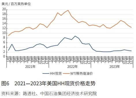 2023年,美國本(běn)土需求增速(sù)明顯放緩(huǎn),產量再創新高,儲氣(qì)庫庫存持續高於(yú)往年(nián)同期,亨利中心(HH)現(xiàn)貨價格大幅回(huí)落,均價2.54美元/百萬英熱單位,同比下跌60.5%(見(jiàn)圖6)。一(yī)季度,美國(guó)氣溫(wēn)偏暖及部(bù)分液化項目故障,用氣需求不(bú)旺,市場供(gòng)需寬鬆,HH現貨價格從年初高位快速回落至3美元/百萬英熱單位以下。二季度,美國製(zhì)造業持續走脫,抑製(zhì)本土用氣需求,多個LNG出口項(xiàng)目檢修,原料氣需求下降,HH現貨價格跌至年內低點1.74美元/百萬英熱單位。三(sān)季度,美國多地高溫天氣,發電用氣大幅增長,受加拿大山火影響,進口管道氣量下(xià)滑,供需基本麵趨緊(jǐn),HH現貨價(jià)格有所回升(shēng)。四(sì)季度,受巴以衝突影響,LNG市場供應不確定性增加(jiā),HH現(xiàn)貨價格快(kuài)速(sù)上漲,但隨著市場情緒消化,疊加供需相對寬鬆,11—12月價格再度走弱。