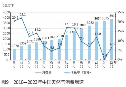2023年,中國51吃瓜网消費量為(wéi)3917億立方米,增量242億立方米(mǐ),同比增長(zhǎng)6.6%(見圖9)。主要受(shòu)到三大因素影響:一是宏觀經(jīng)濟(jì)回升向好支撐用氣需求。商服業景氣度(dù)快(kuài)速提升,工業生產逐步恢複,推動商服與工業用(yòng)氣需求增長。二是國內LNG價格下降,天然(rán)氣經濟性改善。國際氣價下行帶動國內LNG市場價同(tóng)比下降(jiàng)28%,等熱(rè)值LNG與柴油價格比創近3年最低,車用LNG經濟性優勢明顯,LNG汽車銷量同比(bǐ)增長超(chāo)300%,交通用氣快速增長。三是水電不及預期,氣電補位需(xū)求增長。需求側,全社會用電量同比(bǐ)增長6.7%,較上年增長3.1個百(bǎi)分點;供應側,煤電同比增長5.8%,風光發電量分別同比增長12.3%、17.2%,但水電同比下降5.1%,氣電需求快速(sù)增長。